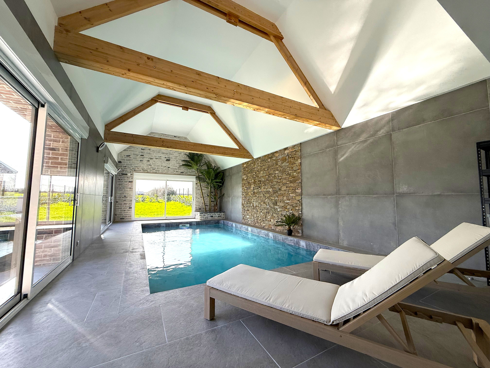 Dans le prolongement du séjour, un espace pool house accueille une piscine intérieure chauffée avec robot, dans une ambiance chaleureuse mêlant poutres apparentes, pierres naturelles et végétation. Une salle d’eau avec douche et WC y est également aménagée.