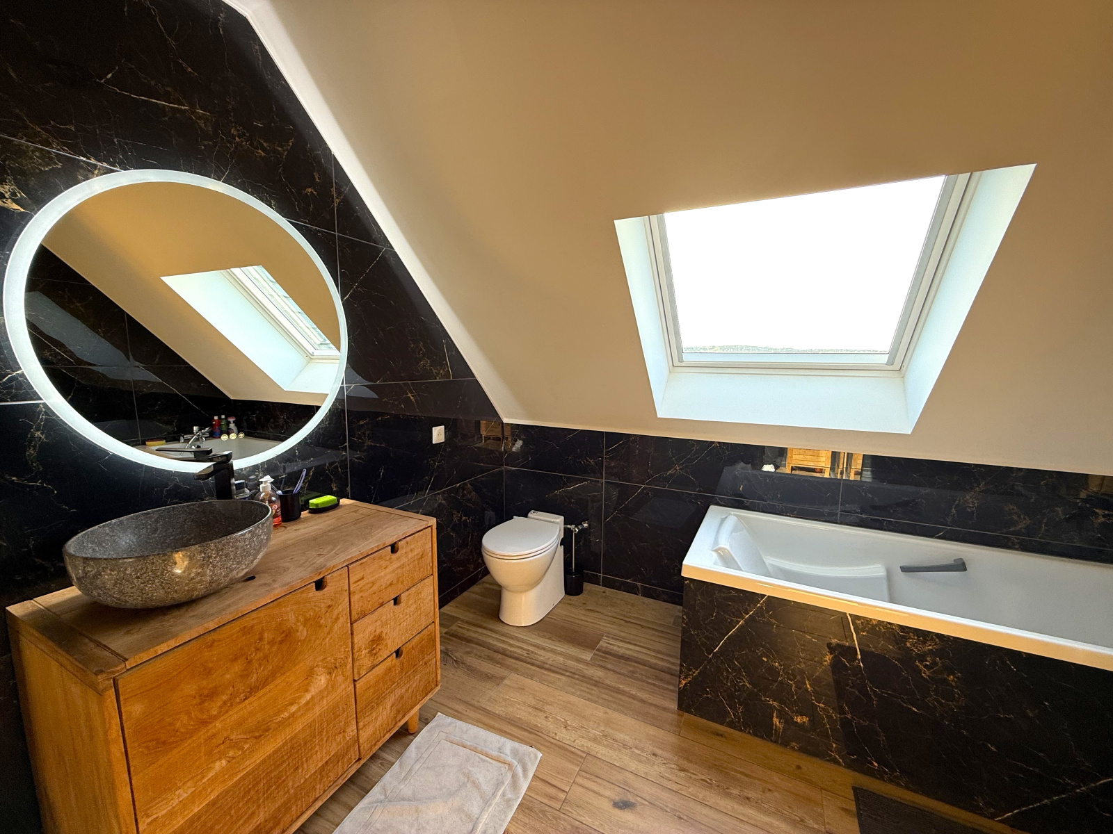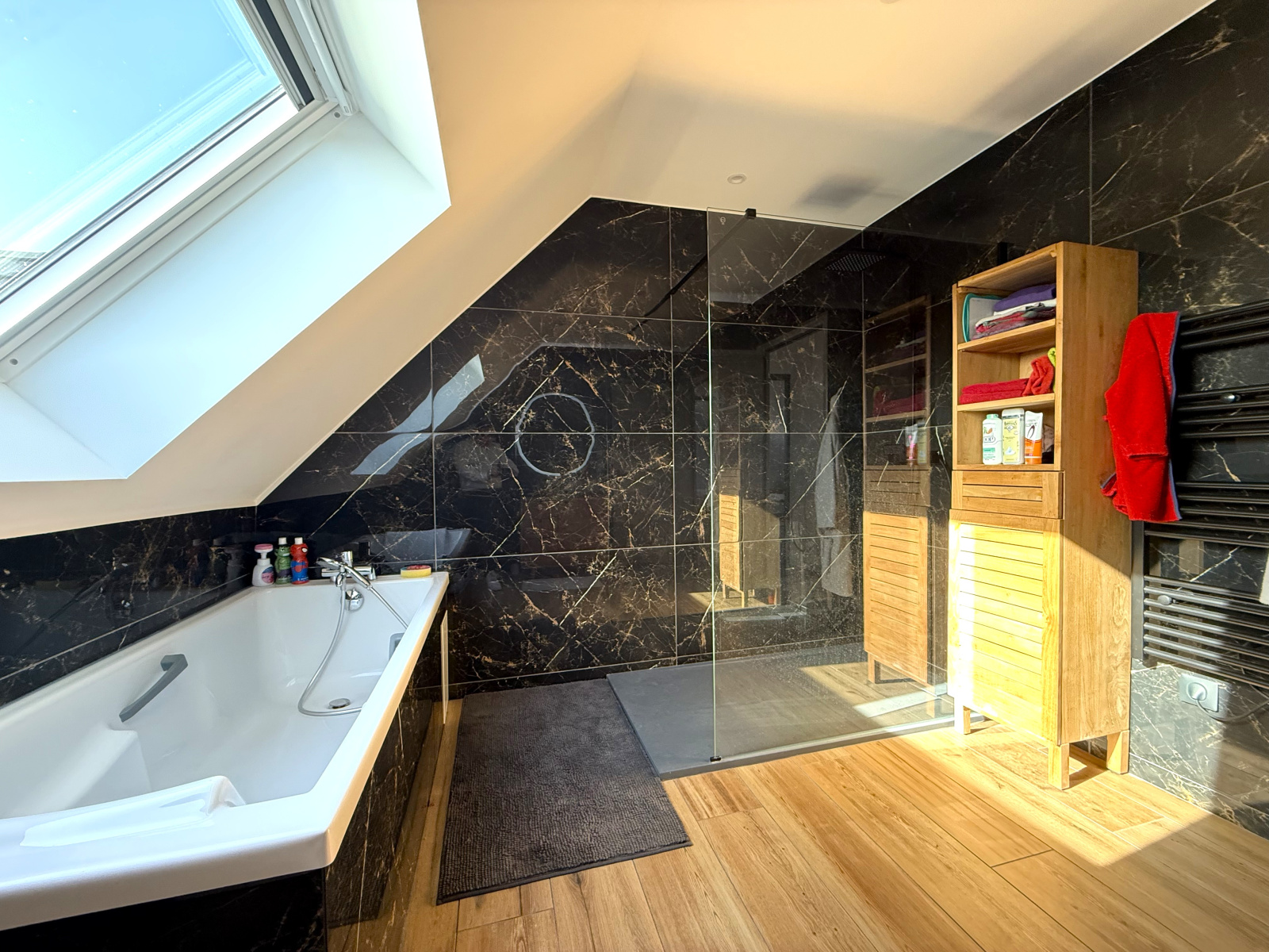 Au rez-de-chaussée, vous trouverez également une suite parentale d’environ 20 m² avec dressing et salle d’eau privative (douche à l’italienne), ainsi qu’un WC indépendant et une buanderie qui complètent ce niveau.