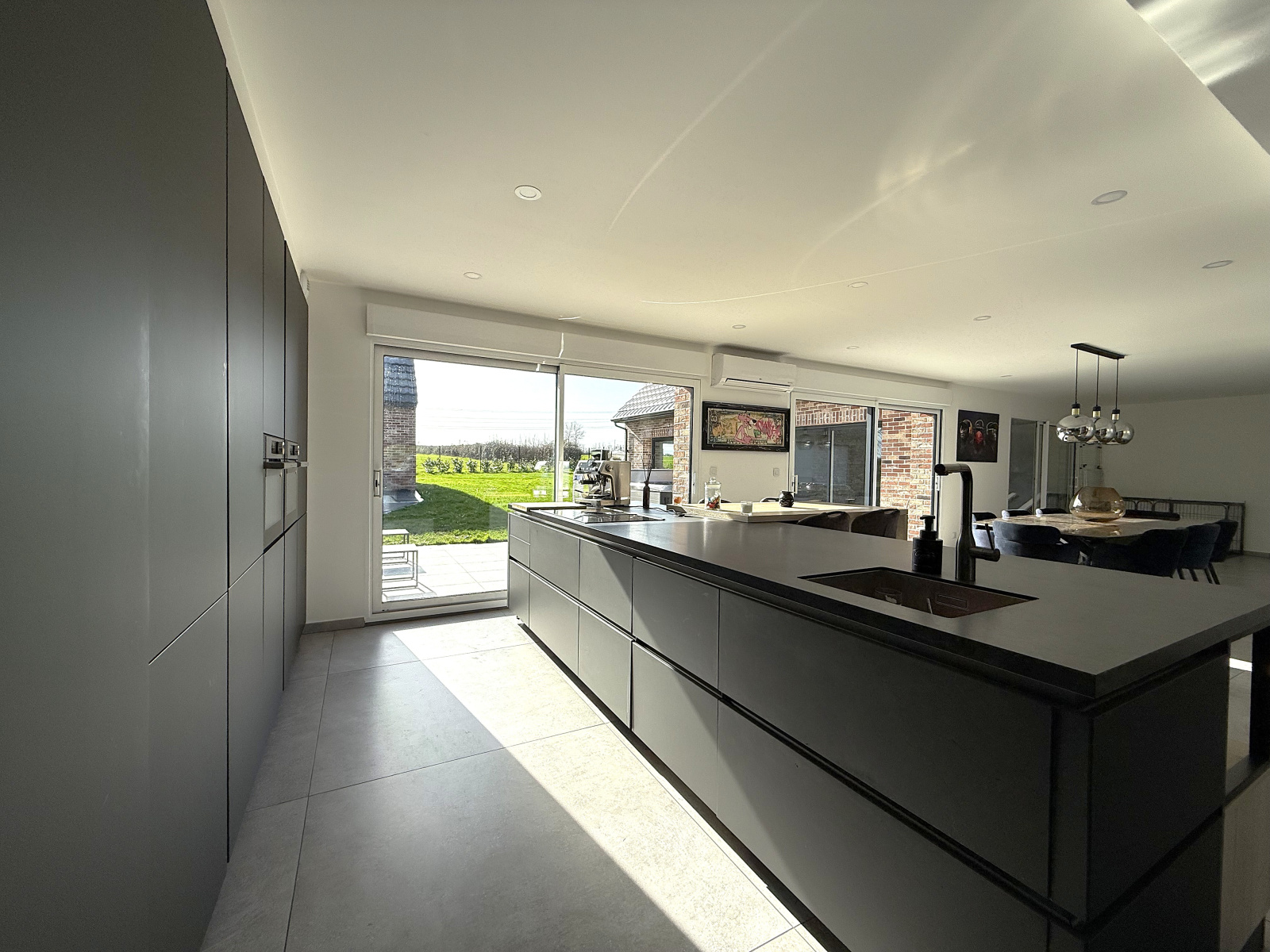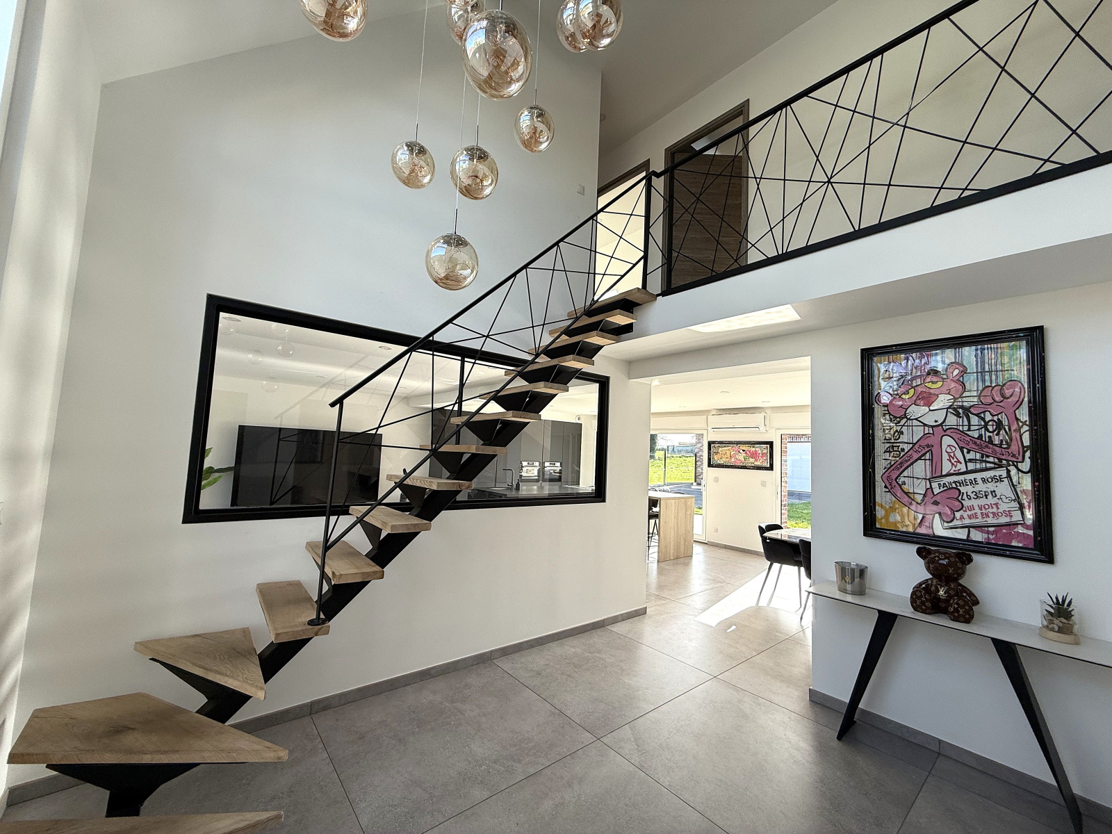 L’entrée cathédrale mène à une grande pièce de vie entièrement ouverte avec cuisine moderne équipée et îlot central.